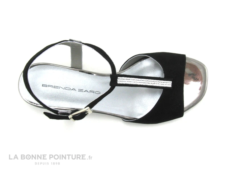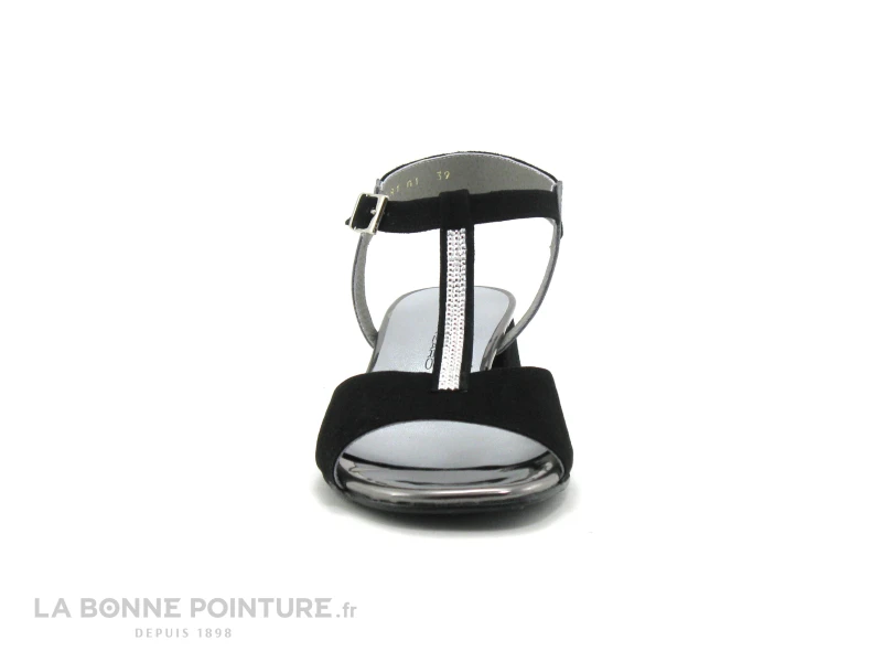 Ces sandales Femme sont en cuir velours noir, avec deux lanières argent sur l’arrière et des petits strass brillants sur la bride salomé.