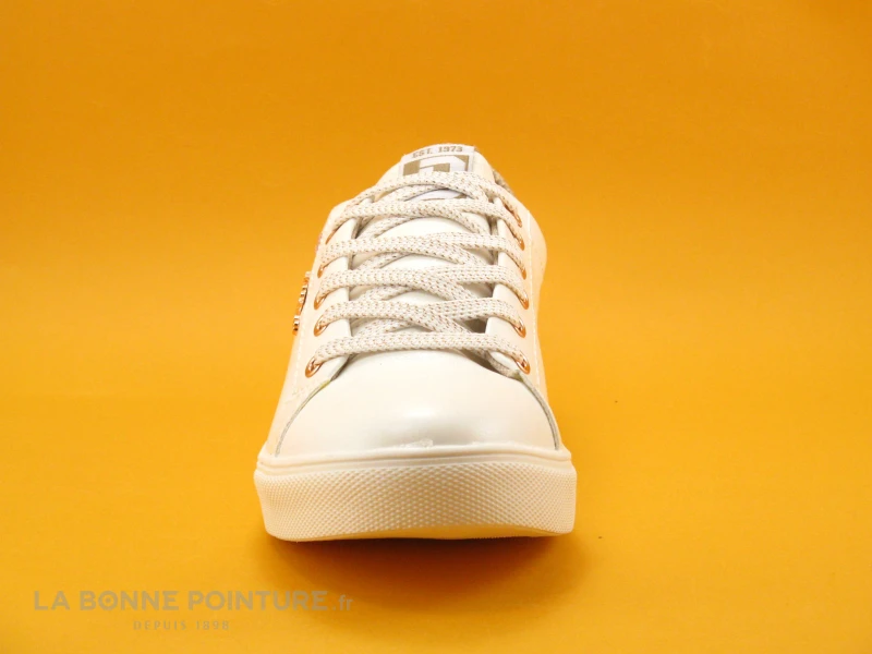 Cette basket blanche Femme est en simili cuir blanc, avec une partie rose reptile et rose mĂ©tal Ă l’arrière.