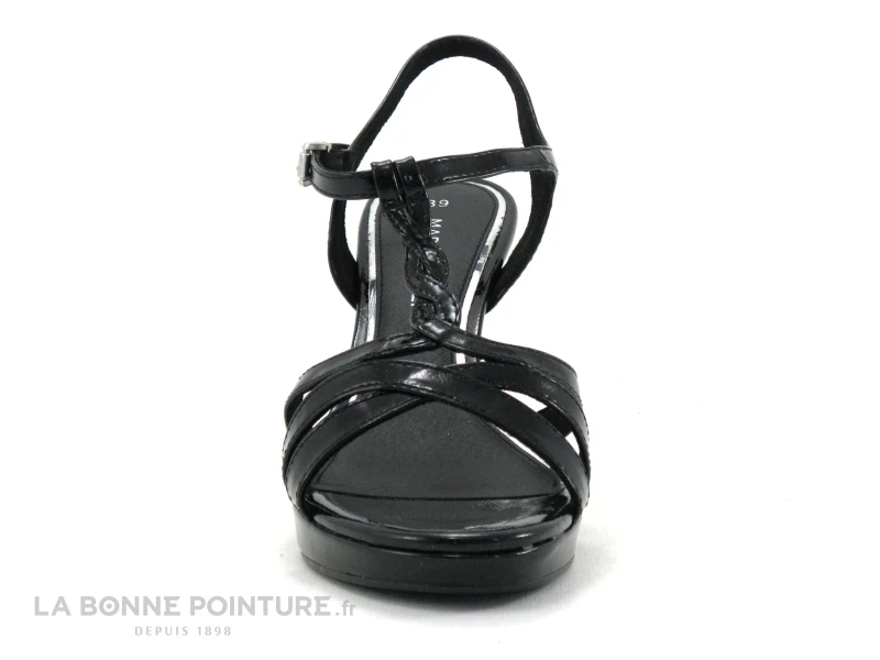 Cette sandale noir verni à talon haut Marco Tozzi 2-28339-28 possède une bride salomé torsadée, qui habille joliment le dessus du pied.
