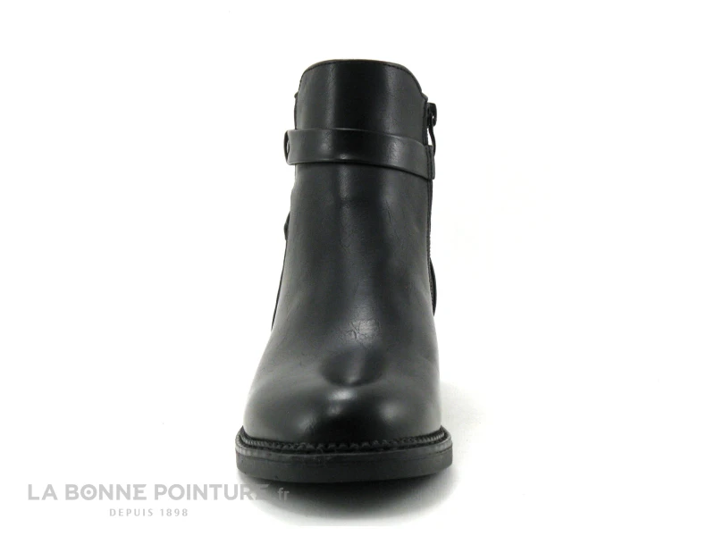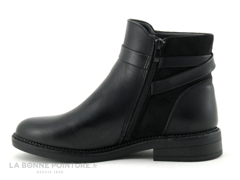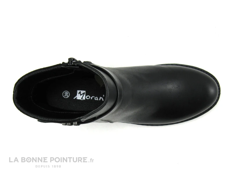 Cette bottine Femme pas chère Moran’s est en simili cuir lisse noir, avec une partie veloutĂ©e sur l’arrière.