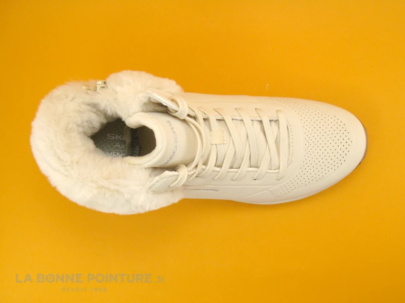 Cette basket montante Femme Skechers Street Los Angeles est beige mat, avec la partie haute en peluche beige, épaisse et toute douce.