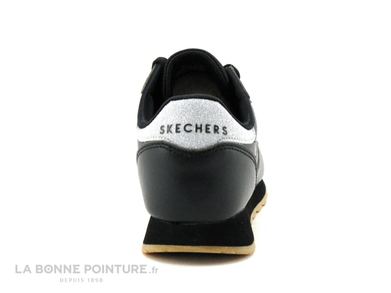 Ces belles baskets Femme Skechers Old School 699 sont en simili cuir noir, avec une partie argent pailleté à l’arrière de la chaussure.