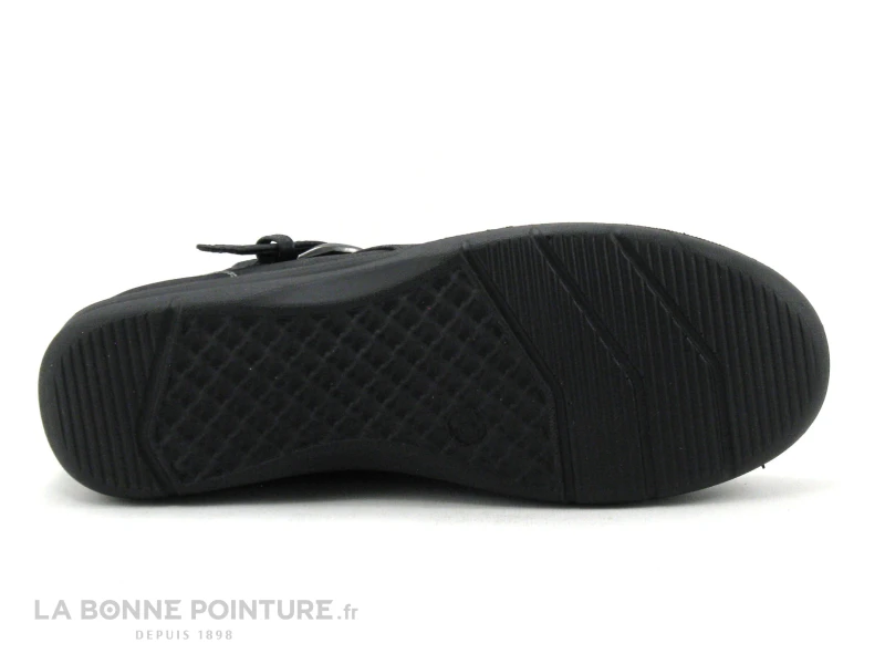 Cette bottine basse Femme est en simili cuir noir, à l’aspect légèrement brillant sur fond mat.