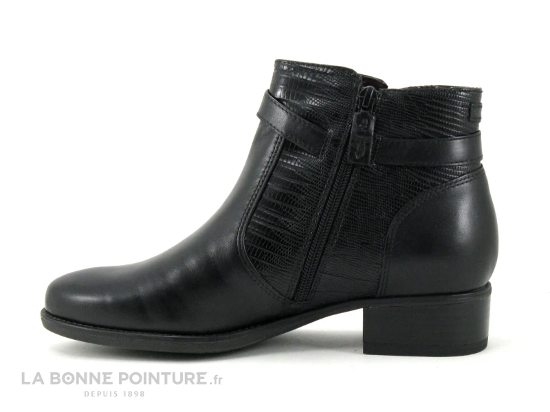 Cette bottine Femme Tamaris est principalement en cuir noir, avec les côtés structurés aspect reptile.