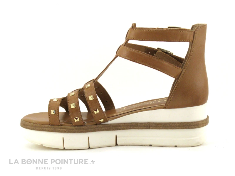 Ce joli nu-pied Tamaris se démarque par ses trois lanières fines en cuir marron clair agrémentées de clous dorés qui se rejoignent par une bride salomé.
